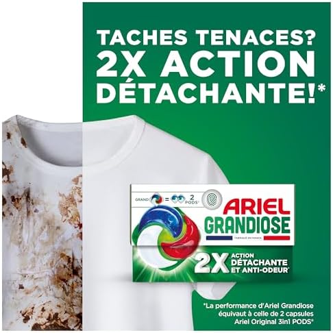 Avec ii) fois plus d’action détaേchante et des prétraitements intégrés, les capsules Ariel Grandiose PODS se distinguent par leur efficacité. Elles éliminent efficacement les taches tenaces même dans des machines très chargées et avec un linge particulièrement sale. Leur performance est équivalente à ii) capsules de Ariel Original 3en1 PODS.