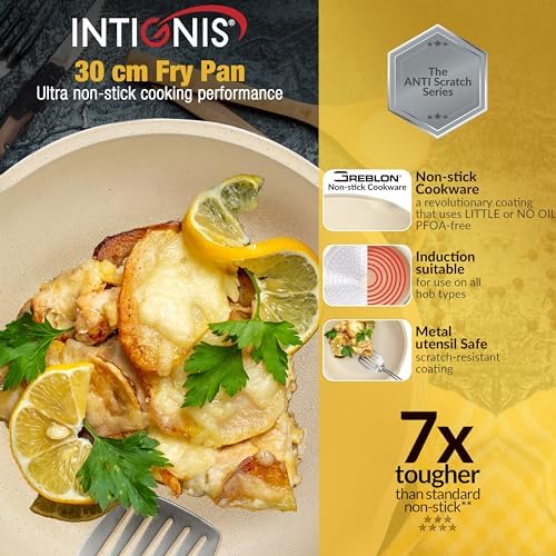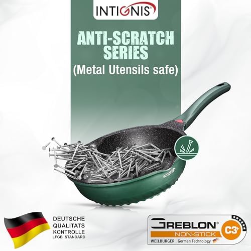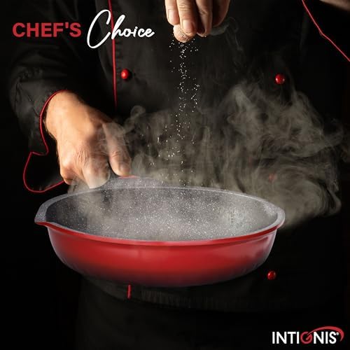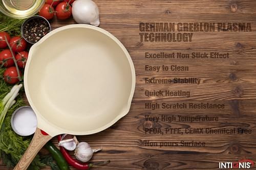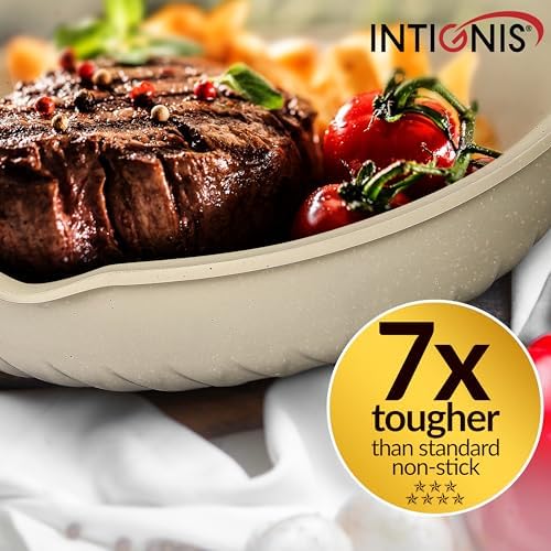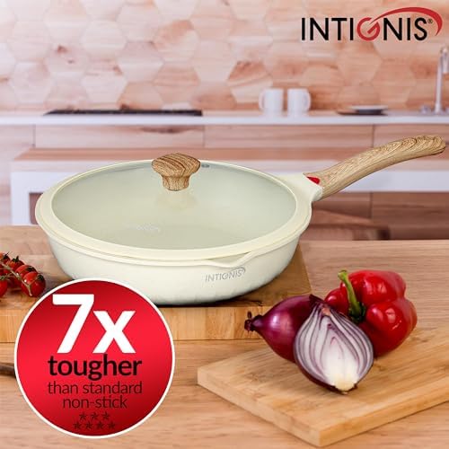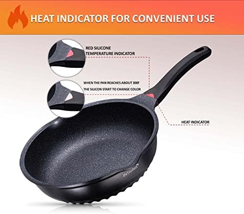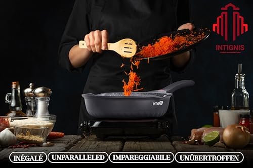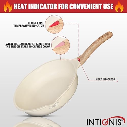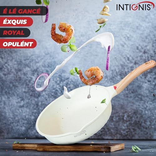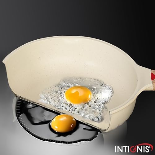 🍳 CONFORT & SÉCURITÉ – Poignée ergonomique en bakélite avec capteur thermique. Cette poêle Intignis induction devient blanche lorsque la température de cuisson optimale est atteinte, offrant un signal instantané et une cuisson sûre.
