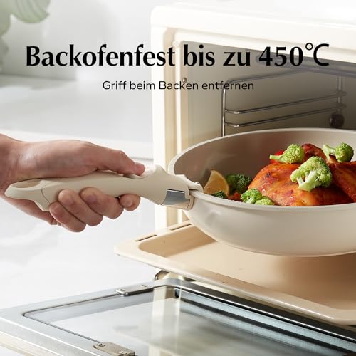 Composants de la casserole: Le set comprend une casserole de 2,7 litres (20 cm), une poêle à frire de 20 cm, et une casserole à manche de 26 cm avec couvercle en verre, bord en silicone et poignées amovibles. La poignée amovible offre une polyvalence ultime, s’adaptant à toute table de cuisson, four, gril, réfrigérateur, ou table.