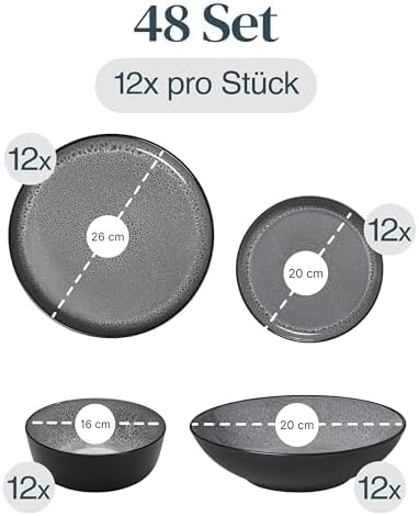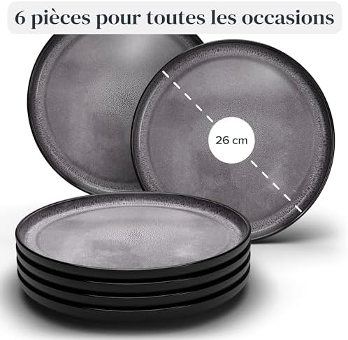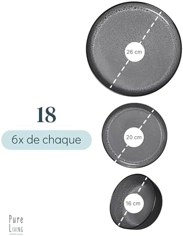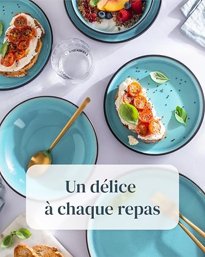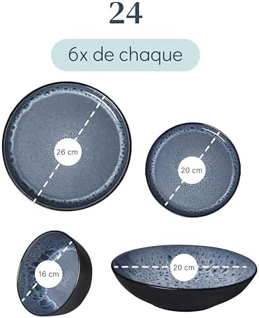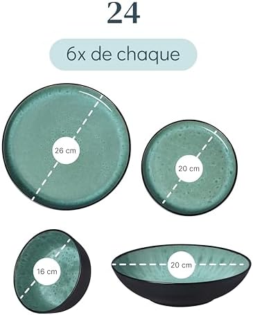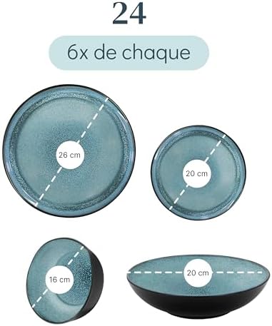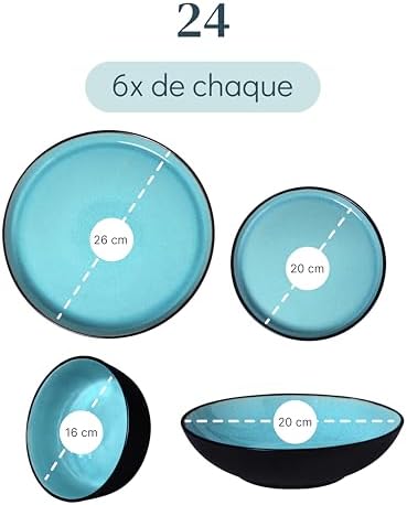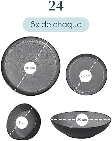 Vaisselle complète de 24 pièces adaptez à toutes les occasions ! Inclut 6 assiettes plates, 6 assiettes pour petit déjeuner, 6 assiettes creuses et 6 bols. Parfait pour votre routine quotidienne et idéal pour les événements spéciaux.