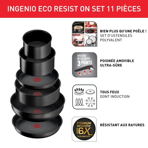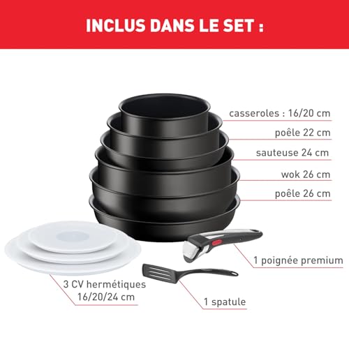 Casseroles (16/20 cm), Poêles (22/26 cm), Poêle wok (26 cm), Sauteuse (24 cm), Couvercles hermétiques (16/20/24 cm), Spatule avec angle et poignée amovible.